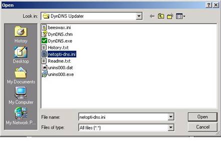 This will launch the Open window, select the netopti-dns.ini file that you downloaded under the clients section on http://www.netopti.net/dns/clients and click “Open”: