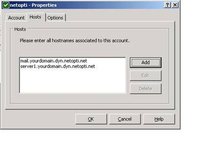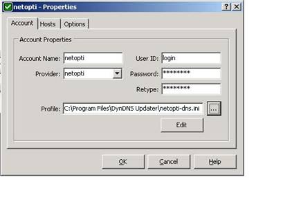 A Properties window will appear. Enter your user ID and password you used when you signed up for your Netopti Dynamic DNS account. At the “Provider” field, you will notice that it’s a drop-down box. Click on this field and type in “netopti”: